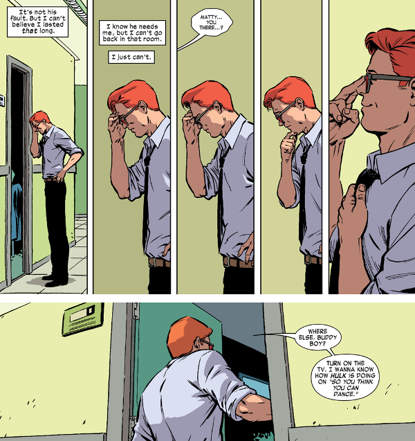 - Daredevil Vol 3 #28 - "I know he needs me, but I can't go back in that room. I can't." (Warning for hospital and character with cancer. He gets better!)
